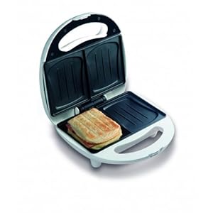 Merkmale: * Für 2 Sandwiches, muschelförmige Backplatten * Antihaftbeschichtung zur einfachen Reinigung * "Cool touch"-Gehäuse * Anzeigelampen "Power on" und "ready" * Kann aufrecht gelagert werden, dadurch Platz sparend * Mit rutschfesten Füssen und Kabelfach